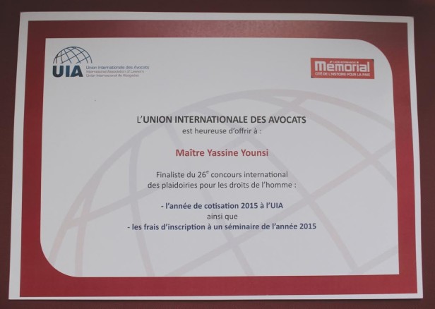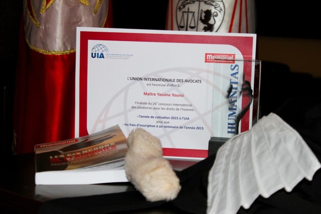 استقبل العميد محمد الفاضل محفوظ أمس الاثنين 09-02-2015 بمقر الهيئة الوطنية للمحامين الأستاذ ياسين اليونسي المتحصل على جائزة  حقوق الإنسان بعد مشاركته بمرافعة بعنوان >>  شكري شهيد الحرية << في مسابقة مرافعات حقوق الإنسان و التي انتظمت بمدينة كان نورماندي بفرنسا .