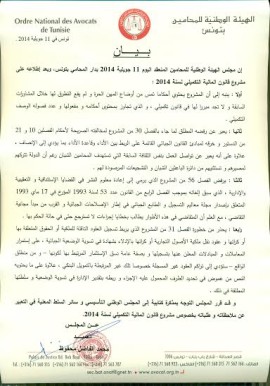 إن مجلس الهيئة الوطنية للمحامين المنعقد اليوم 11 جويلية 2014 بدار المحامي بتونس، وبعد إطلاعه على مشروع قانون المالية التكميلي لسنة 2014 :